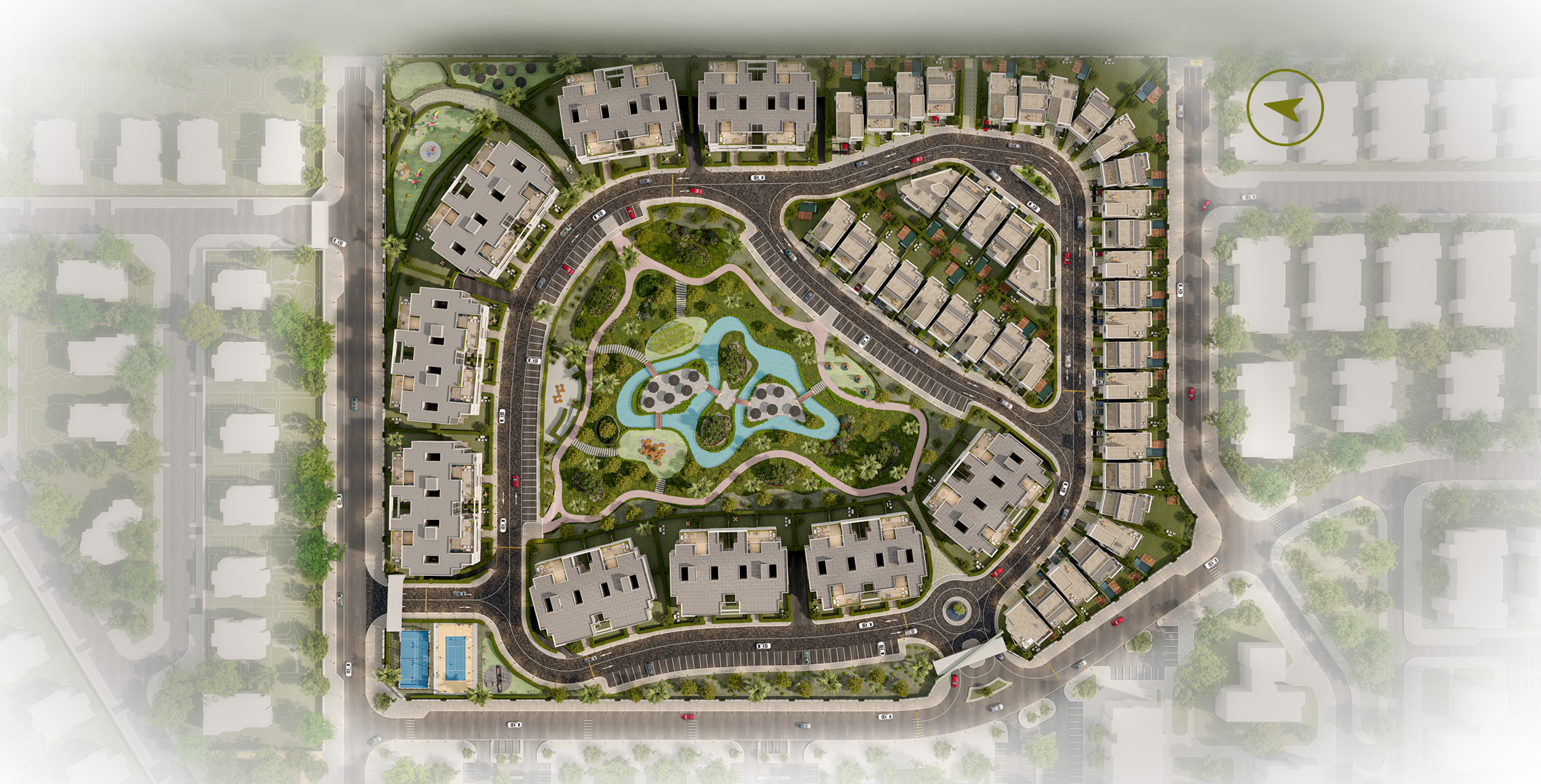 Water features (600 m2 ) • Olympic track • Outdoor gym • Multifunctional space (bbq, yoga, gathering space) • Social space (shaded) • Designated kids area • Enclosed dog park • Electric car charging • Sport Yard (Paddle – Football) • Concierge • Outdoor coworking space • Quiet Reading area • Designated bike parking • 24/7 security • Indoor Parking • Luxurious Entrance • Huge Central Garden • Car Cleaning • House keepin
